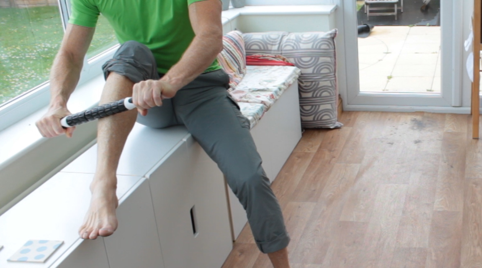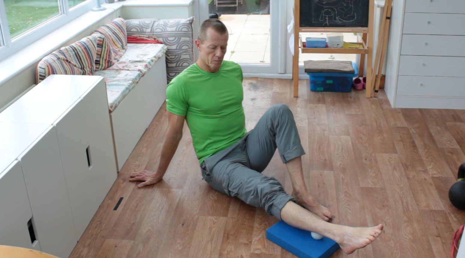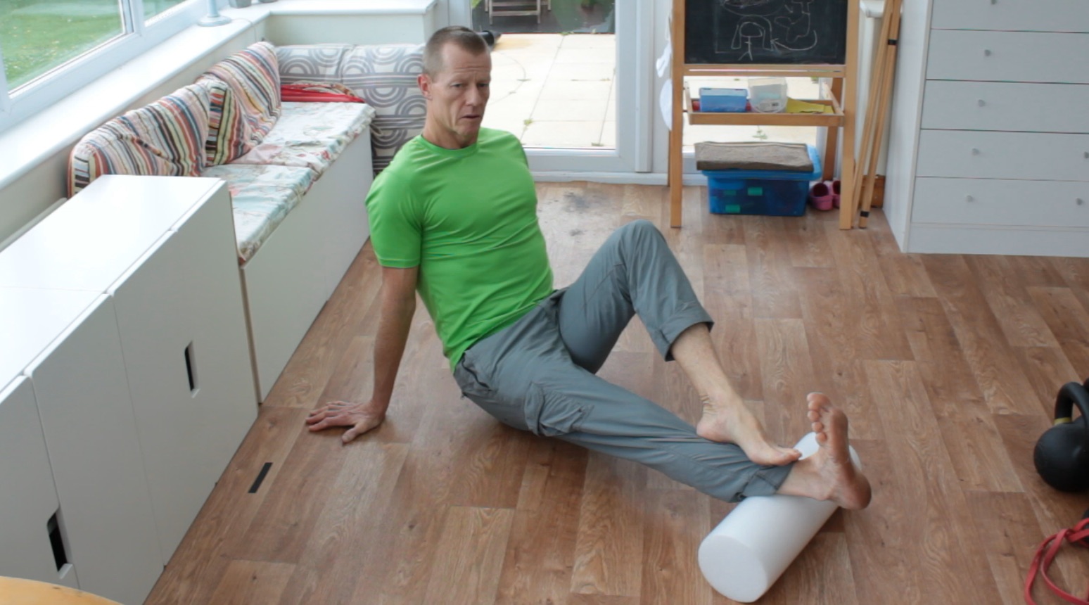 Use the same principle to work on Tibilalis Anterior, although you’ll be using your bodyweight to pin the muscle in place.