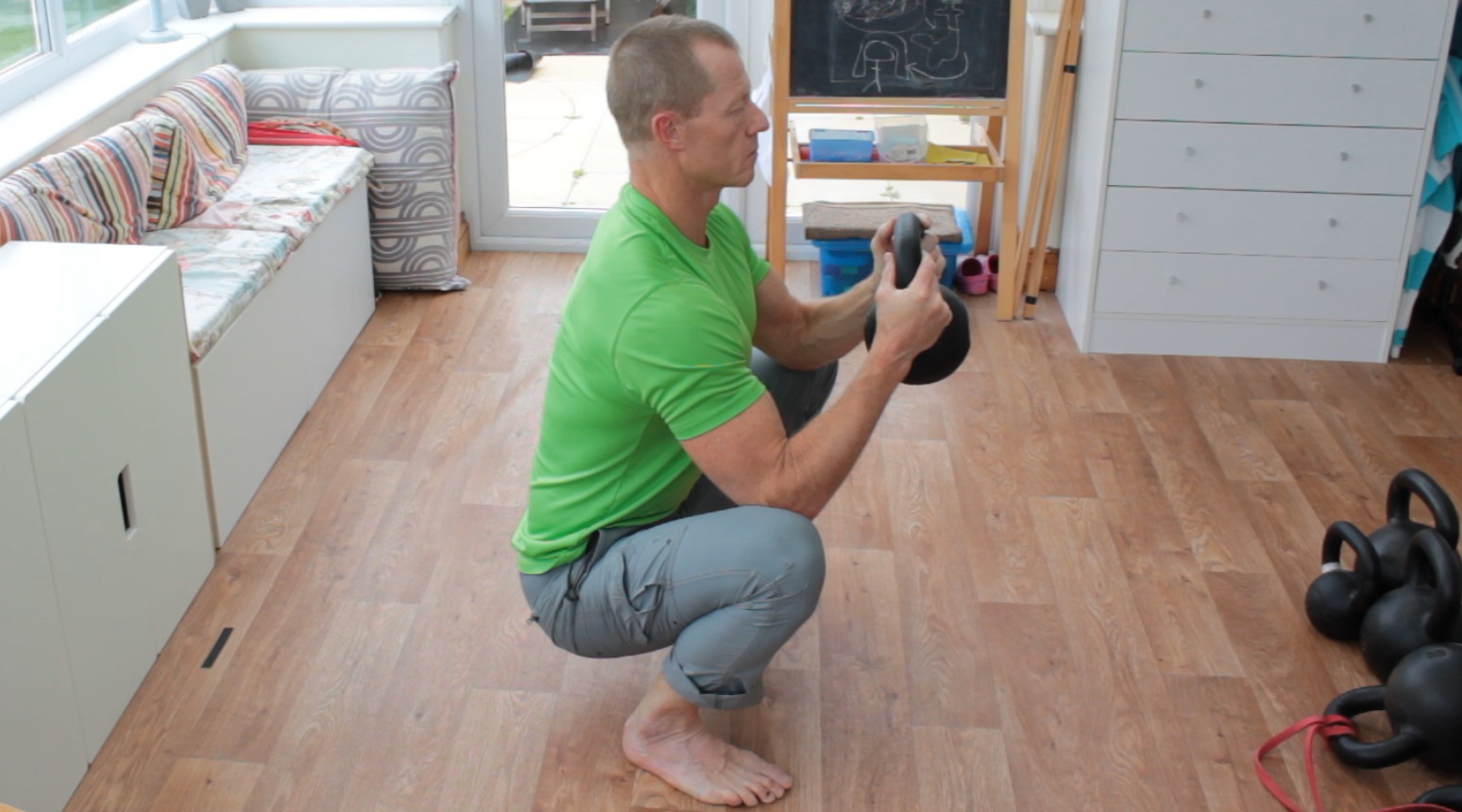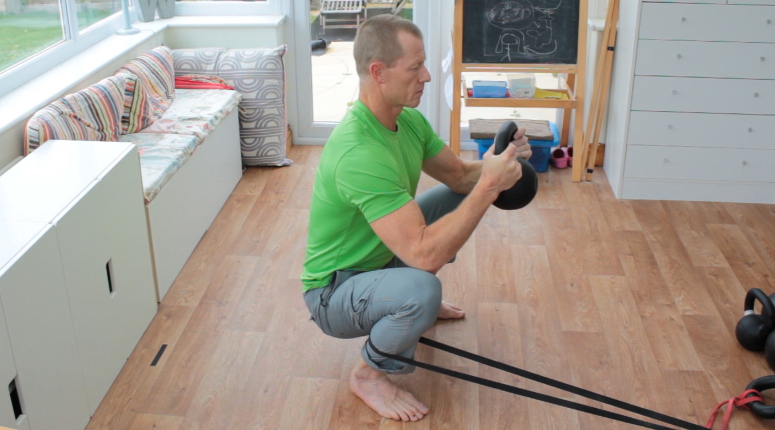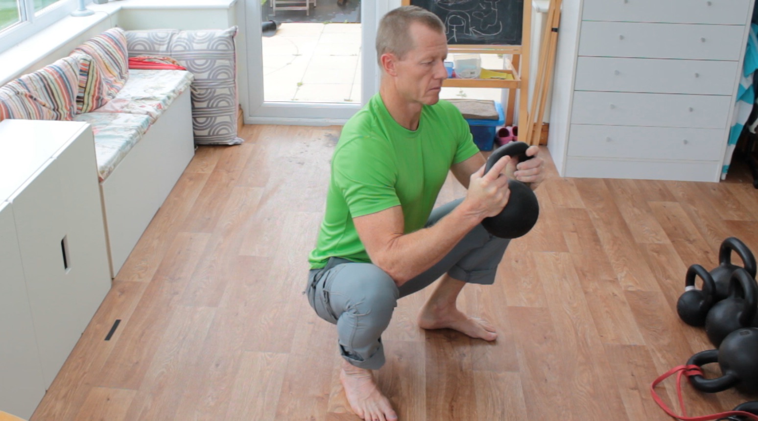 What’s great with the goblet squat is that the kettlebell, dumbbell or whatever you use acts as a counterweight so that you can find a good deep squat position without falling over or fighting to hold the position.