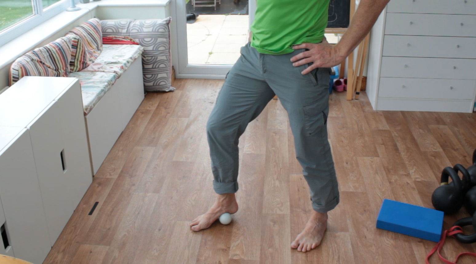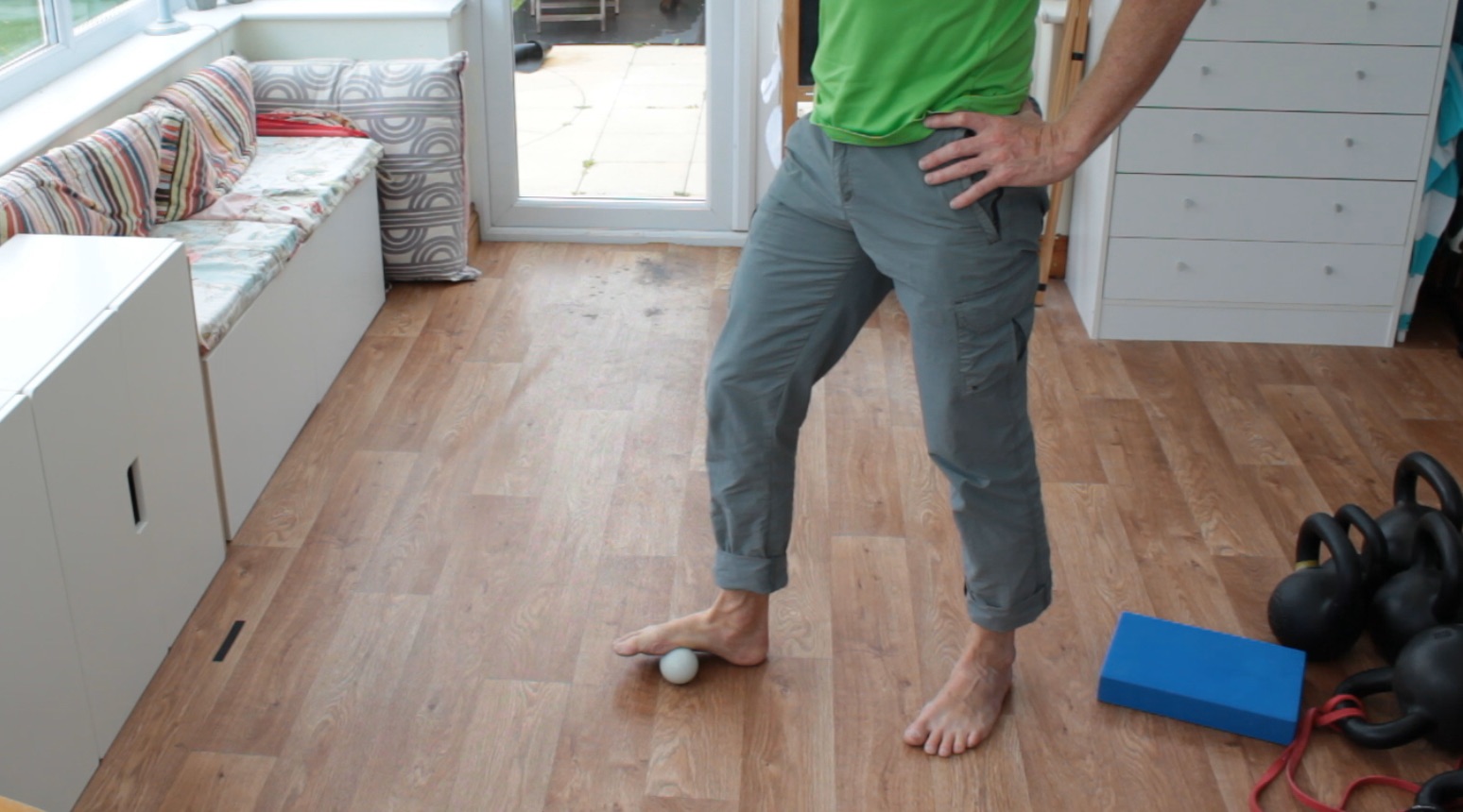 Using a lacrosse ball, start by rolling the length of the underside of the foot and then roll across the fibres, starting at the front of the foot and working to just ahead of the heel.