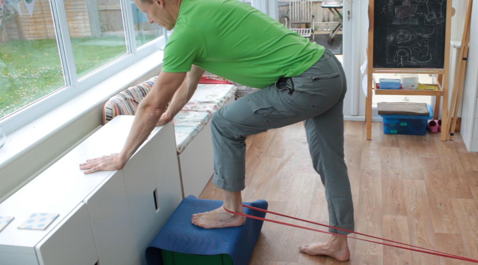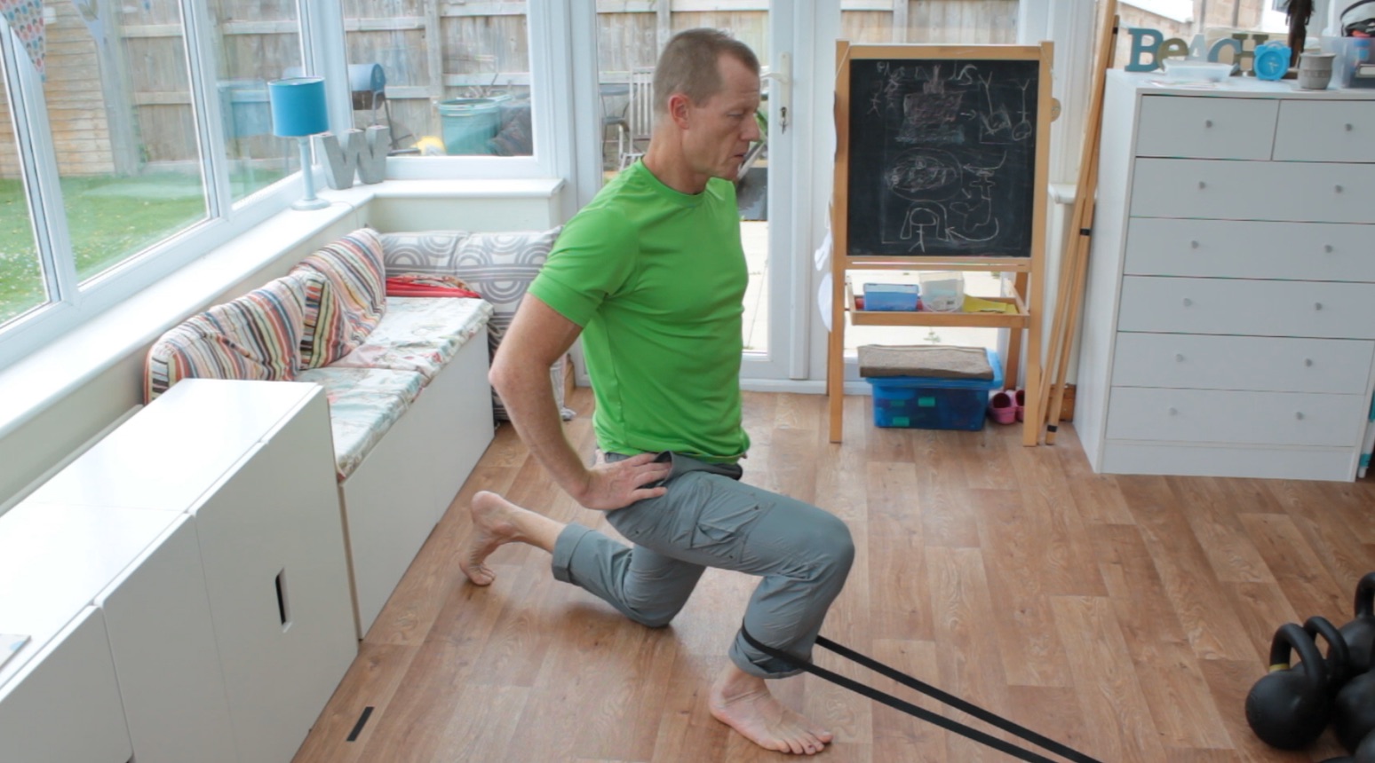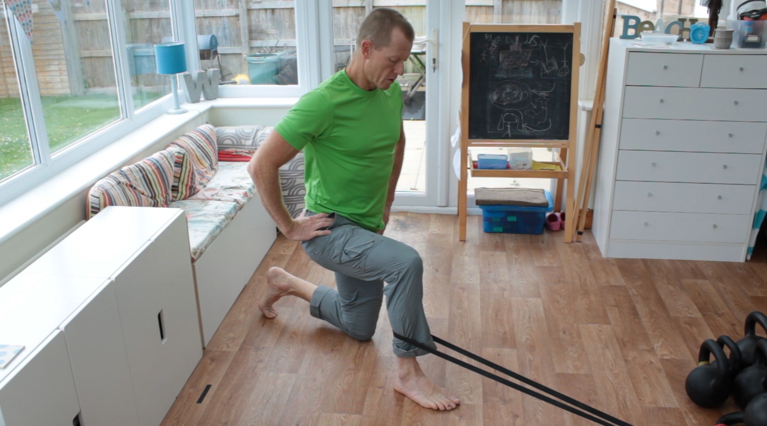 You can also manipulate the tibia position in more of a plantarflexed ankle position by adopting the top of a split squat position with the band in a similar position. Or move between the top and bottom positions of the split squat.