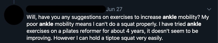 Although all movements can be restricted, the ones where most people notice restrictions are plantarflexion and dorsiflexion. Dorsiflexion is the position that we'll focus on most in this article because the Twitter question was about achieving the bottom position of a squat. I plan to update this article in the near future to include, at least, plantarflexion.