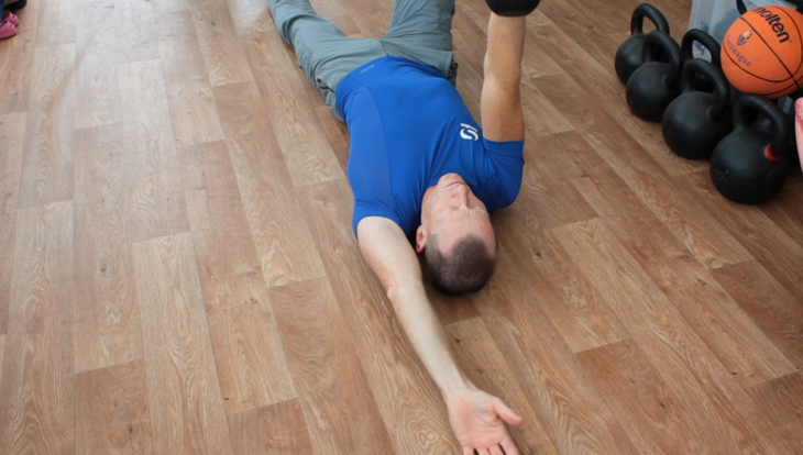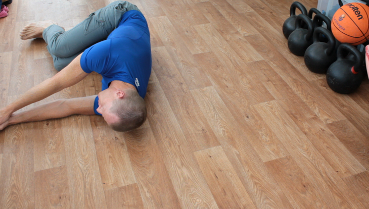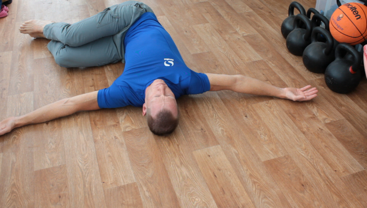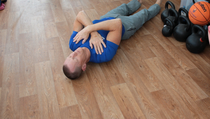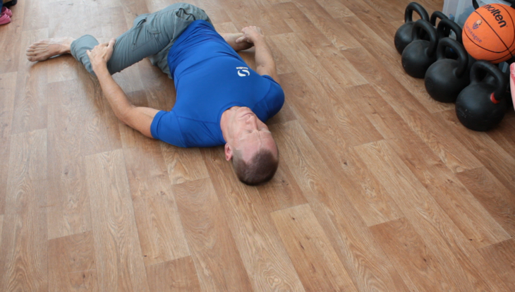 Lying on your side, similar to the book openers, grasp the bottom foot behind you and the top knee in front of you. Aim to get your shoulders flat on the floor (don't force it, relax into it).