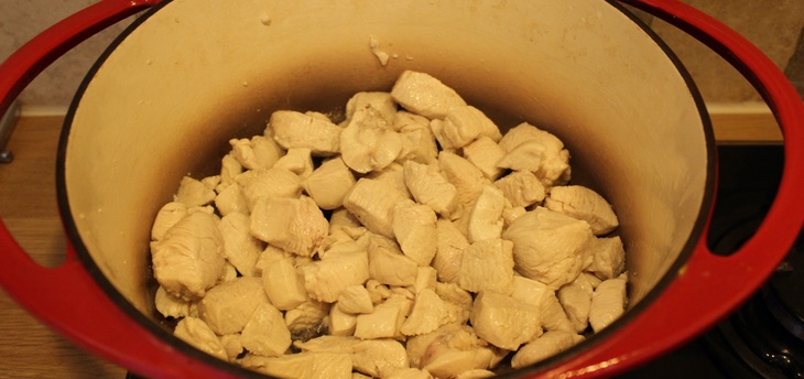 Cook until the chicken is sealed (all surfaces turned white), stirring all the time to get an even colour.