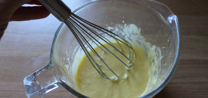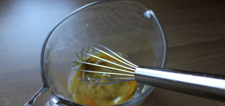 Mix the egg yolk and mustard together in a glass bowl (I use a jug because it has a handle to hold).