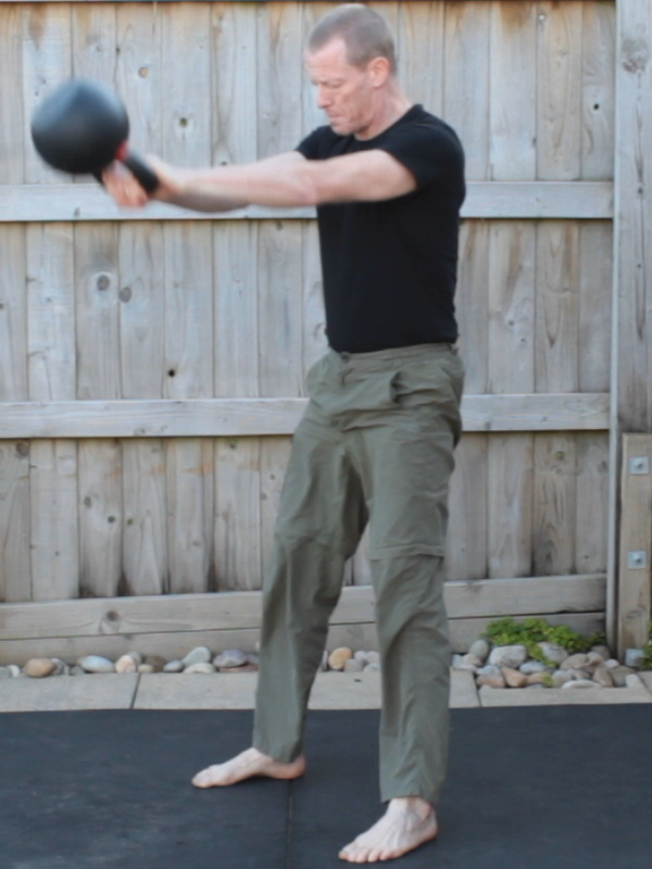 For this exercise, you set up as if to start a set of kettlebell swings, but with a heavier kettlebell than you’d usually use. You then sweep the kettlebell back into the hinged position, loading the hips as usual, perform one explosive rep, catch the kettlebell in the hinged position and replace it on the floor.