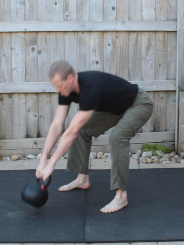 - Catch the kettlebell in the hinge position again and place it on the ground.