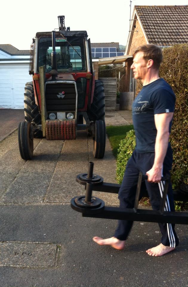 A great way to do this if you’re training at home is to head outside and walk as far as possible away from your house without putting the weight down. Once you’ve had to put it down, turn around and walk home. You may put the weight down as often as necessary on the return leg.
