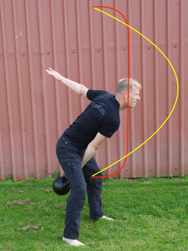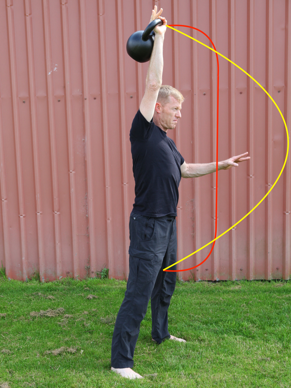 Basically, you’re going to start in the overhead lockout position, perform the hinge pattern at the bottom into a dead stop swing.Your goal is for the kettlebell to take the shorter (red) path, no the longer, looping (yellow) one.