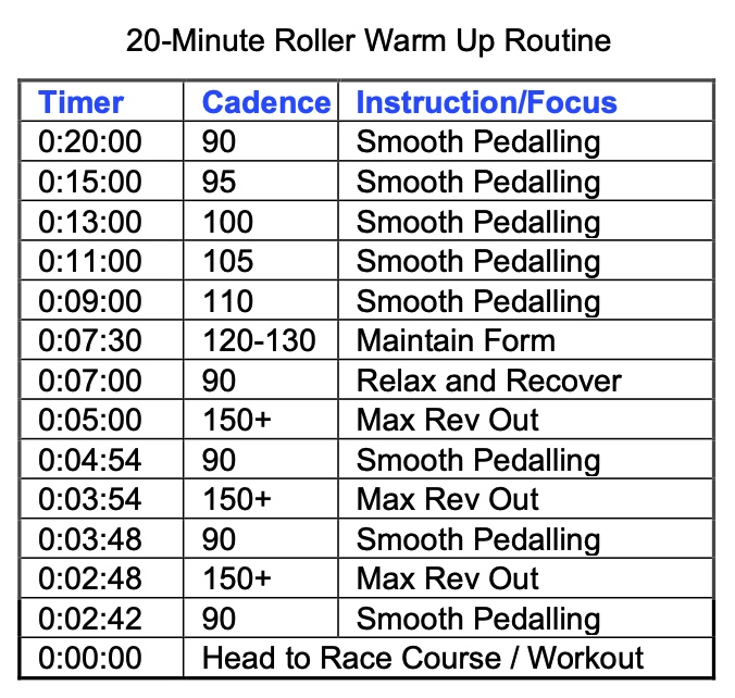 A good warmup is essential or you’re likely to “blow-up” during the first interval. This is my cycling warmup for any interval session. It’s perfectly possible to develop something similar for running, swimming or any other sport.