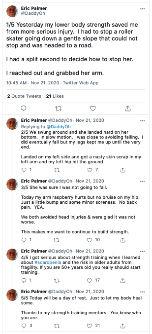 Rather than write a long paragraph about why strength training is important in this context, have a quick read of this tweet from Eric (@DaddyOh on Twitter), where he discovered first-hand just how powerful his strength training is for him.